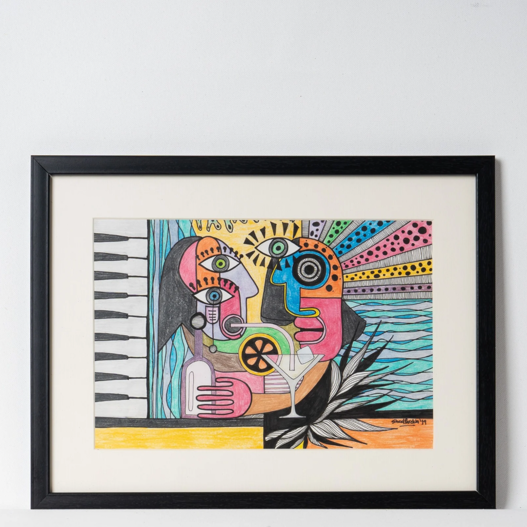 Two souls, one cocktail, and a riot of color. Jazz in a Glass by Sheel Parekh, captures that electric moment when conversation, music, and liquid courage collide. The piano keys on the left flirt with abstract faces sipping from a surreal drink, while the background explodes into a psychedelic sea of sunbursts and waves. Every eye, every shape feels like it’s got a tune of its own, jazzing through the scene with unapologetic confidence.