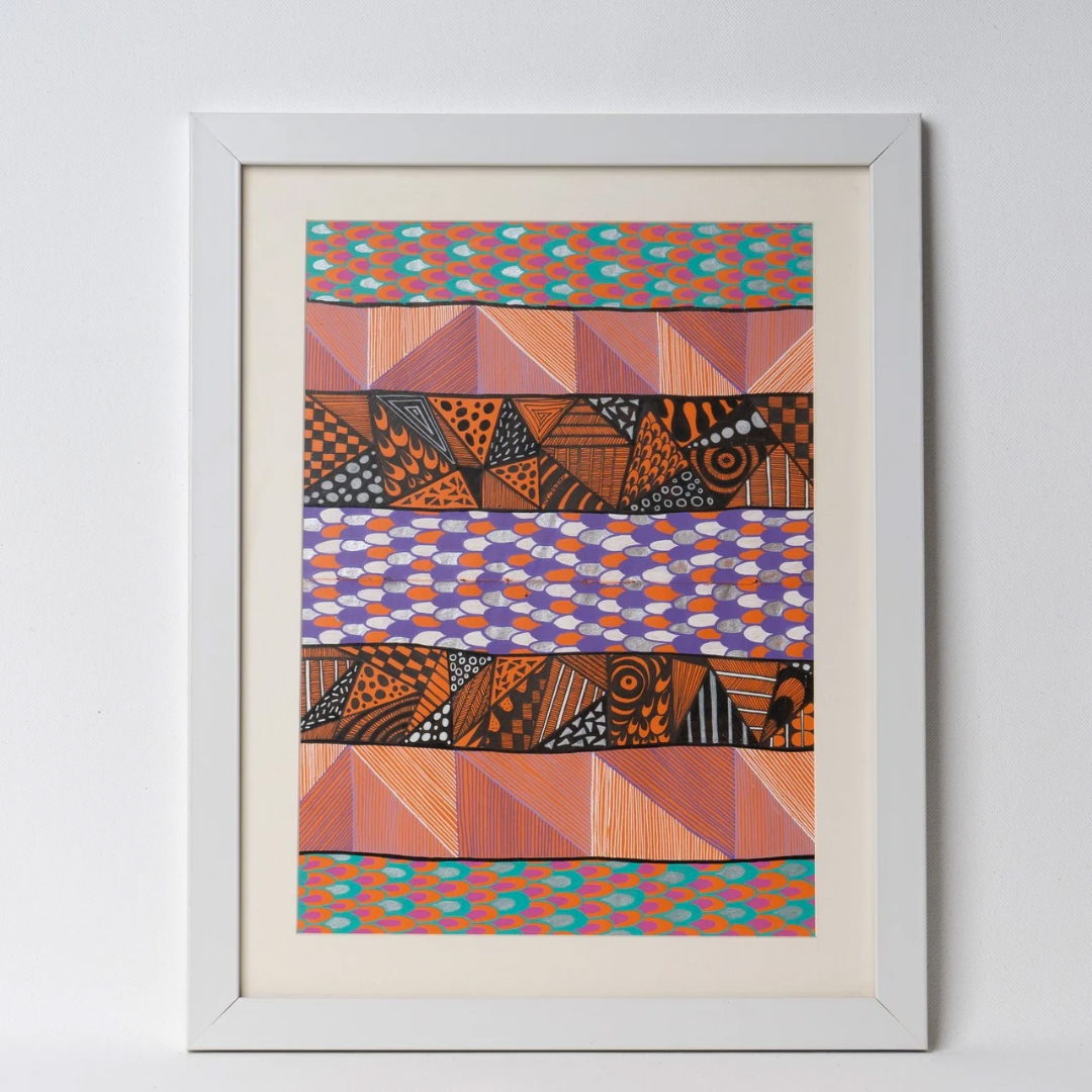 Structured yet organic, this artwork by Sheel Parekh draws inspiration from the intricate layers of the ocean’s ecosystem. Bands of textured patterns and bold colours stack like geological strata, telling silent stories of underwater habitats. The interplay of vivid oranges, purples, and aquatic blues creates a dynamic rhythm, reminiscent of coral formations, tidal movements, and the microcosms living beneath the sea. Part of the marine life-inspired series, this piece captures the harmony between structure and spontaneity found in nature’s underwater designs, inviting the viewer to explore the quiet beauty hidden within the deep.