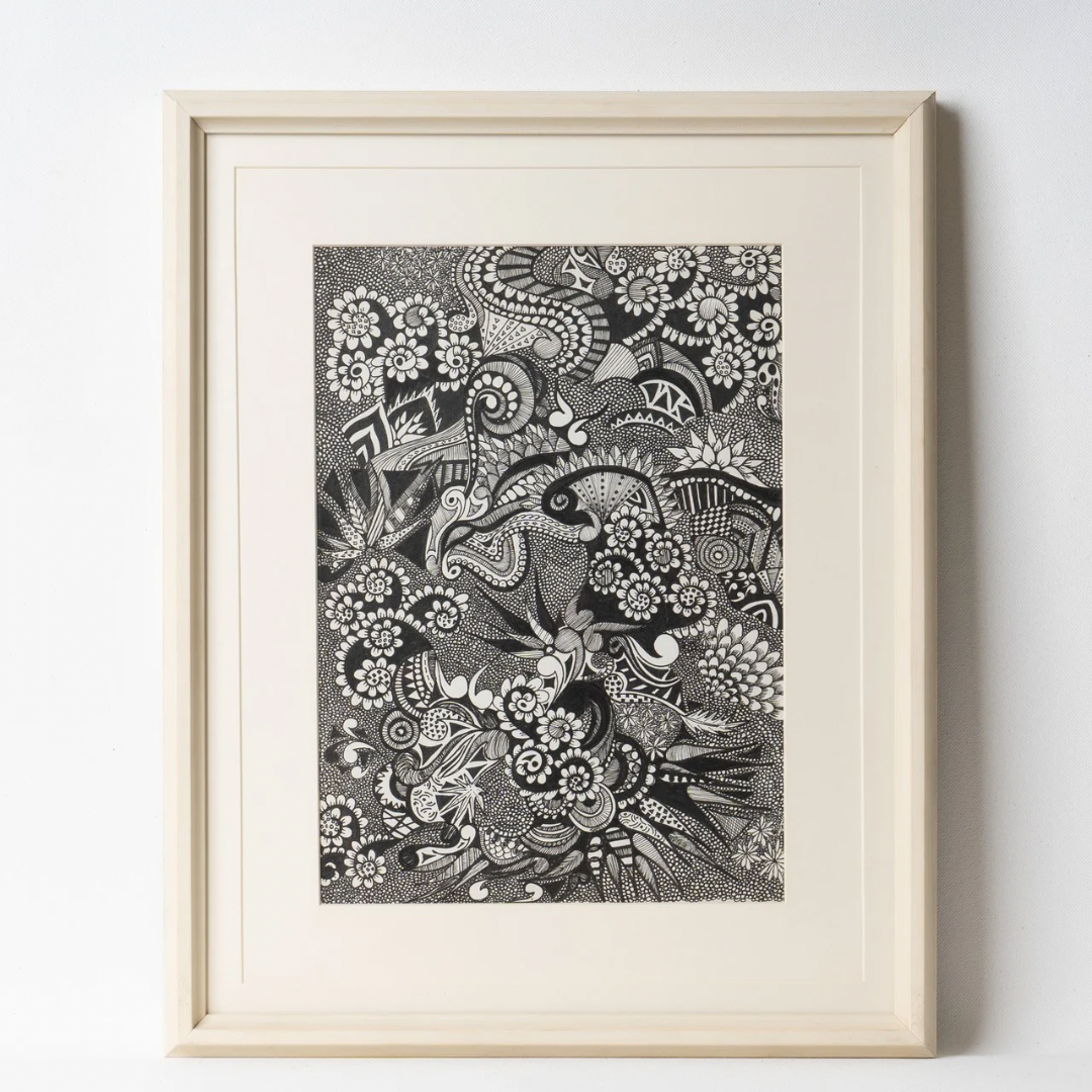 A monochromatic burst of imagination, this artwork by Sheel Parekh unfolds like a secret garden of dreams. Intricate floral motifs intertwine with whimsical patterns, creating a dense tapestry of organic forms and surreal details. Every line and curve feels alive, inviting the viewer to wander through a landscape where reality and fantasy blend seamlessly. The black-and-white palette accentuates the complexity of the design, allowing textures and shapes to take center stage. This piece celebrates the beauty of pure form and detail, capturing a timeless, meditative energy that offers something new with every glance.